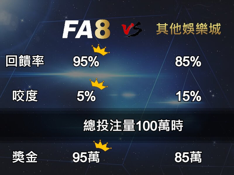 眾所皆知老虎機是可以以小博大,但是對於莊家來說老虎機是一定會賺錢的,所有老虎機的獎金都是由會員的投注額產生,莊家只需要設定咬度為多少趴數即可,一般有名的九州魔龍傳奇老虎機咬度大約在8%~15%之間不等,意思累計總投注量100萬的話,所有的魔龍傳奇會員會拿到大約85萬~92萬之間的獎金,而由誰拿到則是完全機率去決定的,但是在FA8娛樂城中的魔龍傳奇咬度只有3%~5%之間,總投注額100萬的情況下,獎金分配整整多出了10萬元左右,相對的所有會員在魔龍傳奇贏錢的機率就大幅提升。